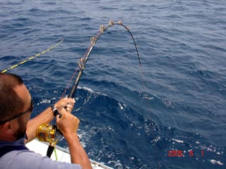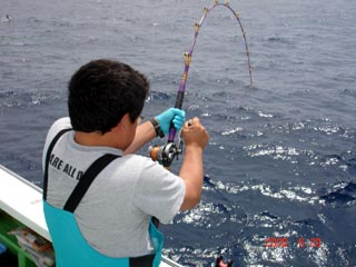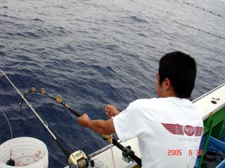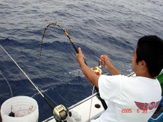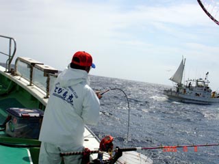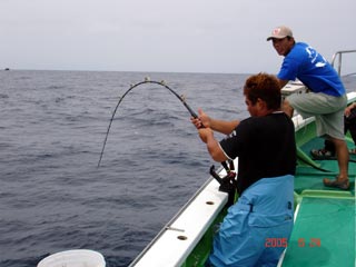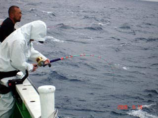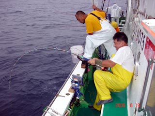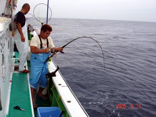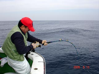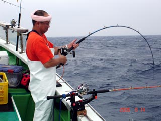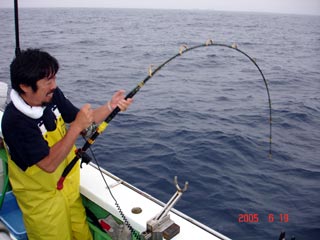 6/13銭洲 谷米秀樹氏のファイトシ-ン 落ち着いた竿さばきです ロッド:ZENISU SP150 リ-ル:JシステムW6 ライン:ウルトラ12号300m