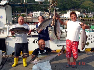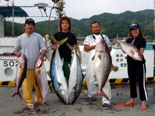 6/01銭洲 右から みゆきサン、 国嶋氏、八塚氏、須藤氏 ムロの泳がせで釣りました!