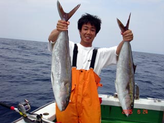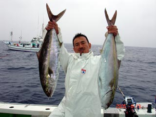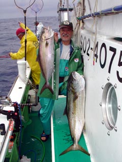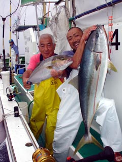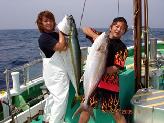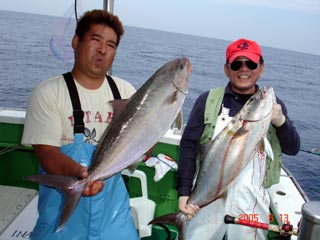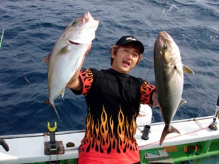6/01銭洲 右 須藤氏 カンパチ11.25kg 左 八塚氏 ヒラマサ 16.7kg 気合入ってます!