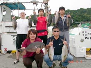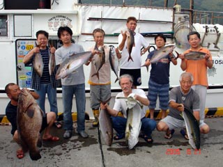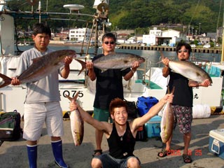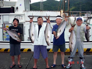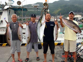 6/08銭洲 右前 宮城氏 カンパチ2本 左前 江藤さん メジナ3.25kg 右後から 福崎氏 森田氏 石橋氏 頑張りました(^。^)!