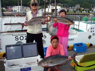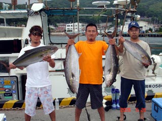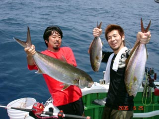 6/25銭洲 右から 鈴木浩二氏 宮城氏 伊東氏 前 Wataru 良型カンパチです!全てムロ餌!