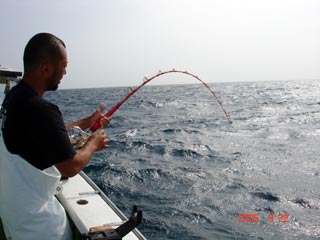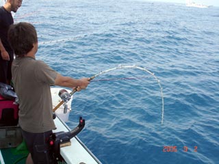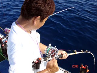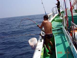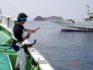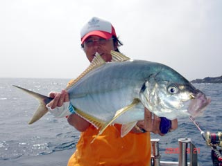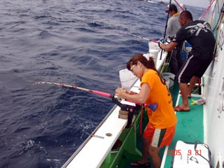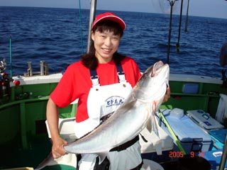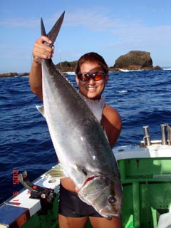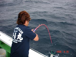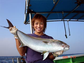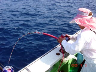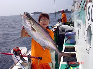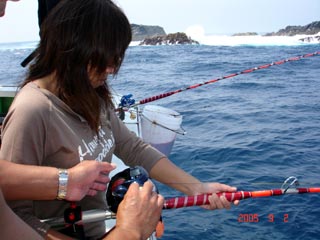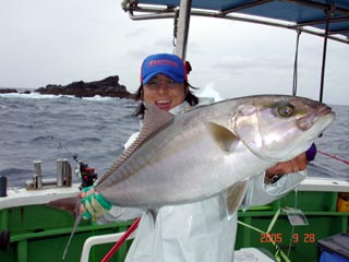9/02銭洲 レディ-ス月間 カンパチGET第1号! 鎌田 上田久美子さん DAIWA ブルでファイト中!竿:インディベンテンス