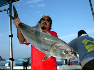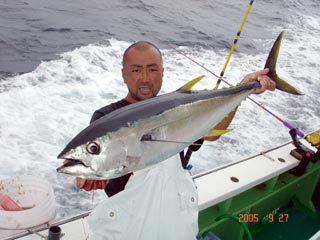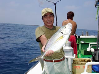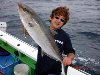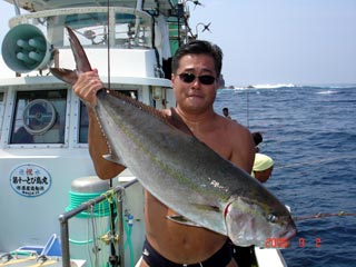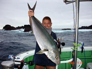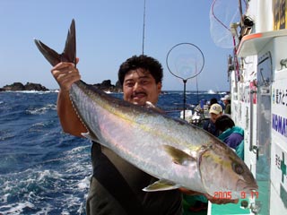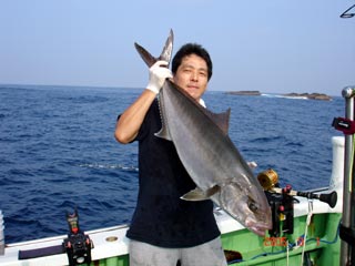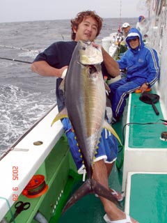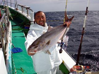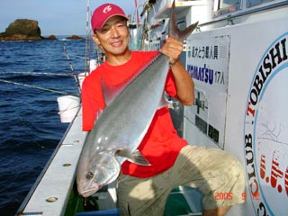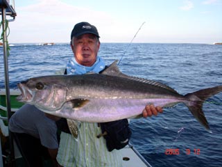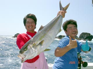 9/02銭洲 東京都 田口 豊 タケ蔵かかってこんかい!氏 いやぁ~ここのとこのボ-ズにかなり悩みました。 秘密兵器を持ち込みカンパチ7.9kg ヒラマサ9.85kg GET! サンゴ堂のタケさんには負けませんよ(^v^)