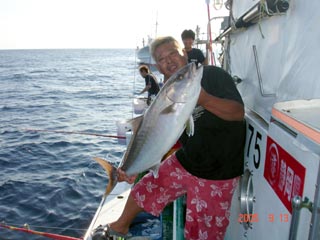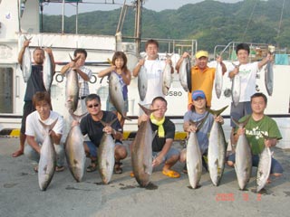 9/02銭洲 前列右~ 佐々木氏 カンパチ8.25kgハガツオ 前列右2番 田口氏 カンパチ7.9kgヒラマサ9.85kg 前列中央 柏木君 カンパチ13.85kg 前列左2番 宮城氏 カンパチ6.55ー10.2kg 前列左 森さん カンパチ5.9kg 後列右1.2番 市川氏 田中氏 ハガツオ5本! 後列中央 上田氏 カンパチ3.0kgハガツヲ 後列左3番 久美子婦人 カンパチ6.5kg 後列左2番 鈴木氏 カンパチ6.8kg です!皆さんナイスファイトでした!