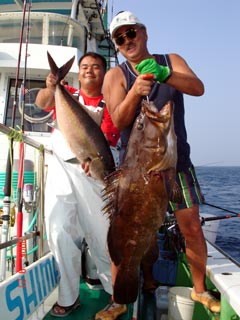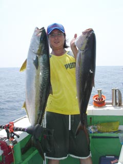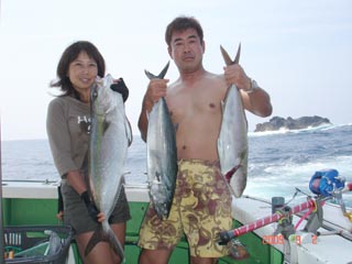 9/02銭洲 入籍まもない上田夫妻 カンパチ6.5kgと3.0kg ハガツヲ 仲良くやってください(^v^)
