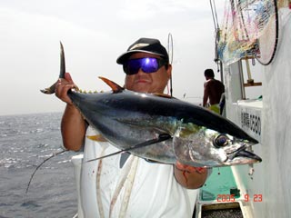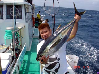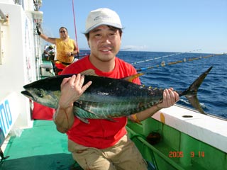 9/27銭洲 善如寺氏 キハダ7.3kg! デカク見えるでしょう(^v^)山口さんには負けませんよ!がはは!与那国頑張ってください!