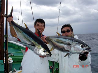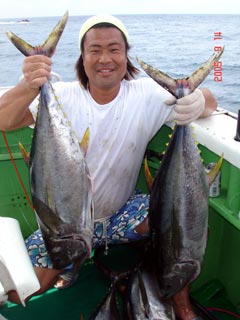 9/27銭洲 右 竿頭の宮城氏 キハダ7.5-10kg3本 左 運気上昇の伊藤氏 キハダ9.45-10.6kg2本 伊藤さん!次回はカンパチお願いしますよ!