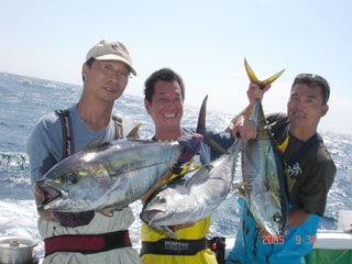 9/27銭洲 右 川崎区 菊池氏 キハダ7.3kg 左 岡野氏 キハダ6.9-7.75kg3本 中央は川崎シマヤ釣具 山口店長です! 後は亡霊?の善如寺氏かな(^v^) 岡野さん!次回はカンパチGETお願いします!