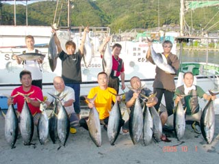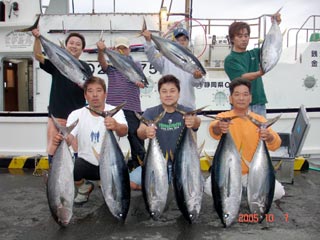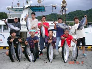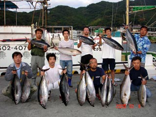 10/06銭洲 前列右~ 望月氏 国嶋の代理持ちカンパチ4.1-8.3kg 国嶋 満 キハダ6.65-15kg4本 石津氏 キハダ11.8-12.0kg2本 石川氏 キハダ10.4-12.45kg2本 後列右~ 谷米氏 キハダ12.0kg 水村氏 キハダ12.0kg、皆川氏 キハダ7.6kg 渡部陽介氏 カンパチ9.65kg 大崎氏 キハダ7kg級です! キハダ!ボ-ズ2人!コマセワ-クですかね~