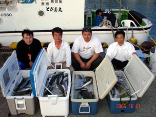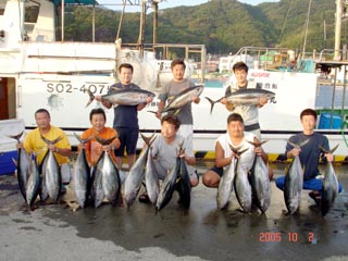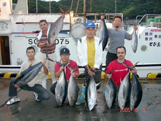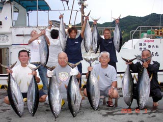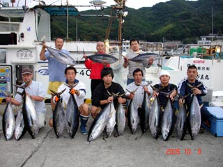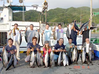 10/04銭洲 前列右~ 中村氏 キハダ5.3-7.05kg2本 鈴木氏 キハダ8.6-11.3kg3本 藤貫氏 キハダ6.7-11.5kg7本 相田美鶴さん キハダ7.55-9.05kg3本 相田氏 キハダ9.0kg 佐々木氏 キハダ7-11.9kg3本 後列右~ 国嶋&山田石油 藤貫氏の代理持ちシャチホコスタイル 紫タオル 谷氏 これも藤貫氏の代理持ち(ーー;) 山崎氏 カンパチ2.55kg キハダ10.25kg 牛島氏 キハダ6.8-7.8kg2本 河合氏 キハダ5.2-6.4kg2本