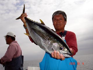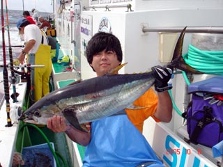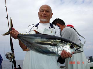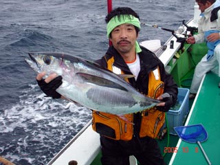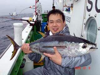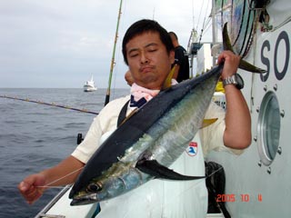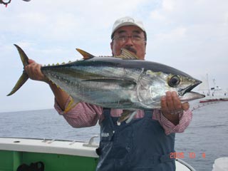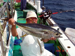 10/05銭洲 赤坂慎一氏 初!キハダGET! 船をグルッと(@_@;) 大型に振回されました! 14.3kgは立派です!おめでとう!