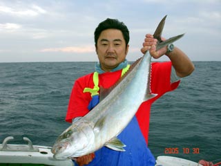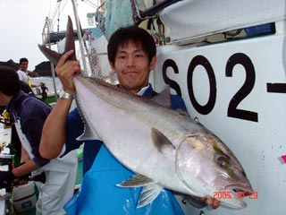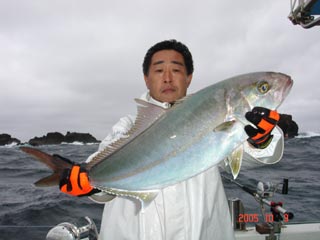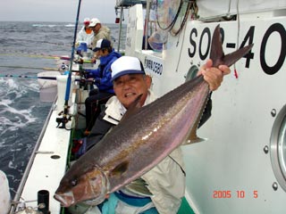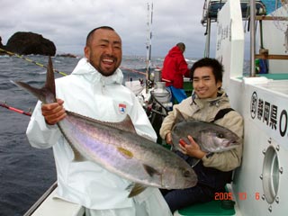 10/05銭洲 右 渡部陽介氏 初のカンパチ9.65kgGET! 銭洲3度目でGETしました!おめでとう! 左は国島氏 カンパチ8.3kgです