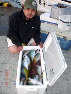 10/21銭洲 五目バリバリ!青鯛、ウメイロ、メジナです! 右から都築氏、小林氏、安田氏、今井氏 ク-ラ-満タン!?(^。^)