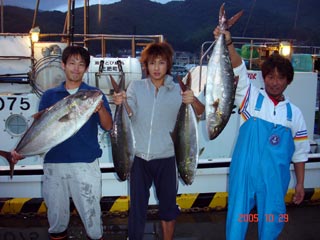 10/29銭洲 左から 石丸氏 11.2kg 熊谷氏 4.9-6.6kg3本 と代理持ちの山田氏です(^o^) やりました!