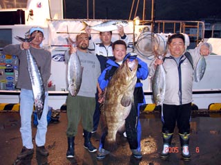 11/06銭洲 前列右から 窪田氏 カンパチ4.1kg 柴田氏 モロコ29.45kg 国嶋氏(柴田氏の代理持ち) カンパチ4.55kg 浜 氏 サワラ6.4kg 後列 男!柳田 ! ヒラマサ2.95kg