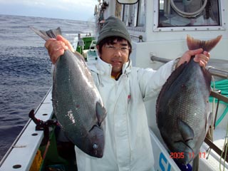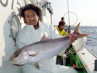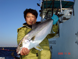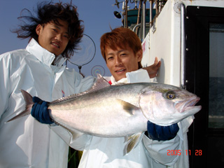 11/28銭洲 新宿 坂上氏 カンパチ初GET! 5.6kgです! 左は慎一氏 次はモロコ!! 頑張ろう!