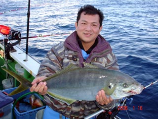 1/16藺灘波 三島つばさ寿司本店 丸子淳平氏 カンパチ11.4kg 皆さ~ん!またまたカンパチ釣りました(~o~) 山田さん!サガミのマスタ-!星川さん! 見てますか(^v^)うりうり。ははは!