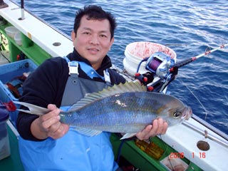 1/09藺灘波 タキグチ組 伊倉氏 2.15kgのアオダイです! メダイの様に強かったです! |