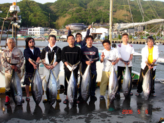 5/08イナンバ 右~金子氏、国嶋氏、丸子隊長、香川氏 左~大魔王長谷川氏、松井親方、賀川氏、山田氏 爆釣です!