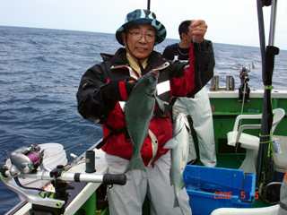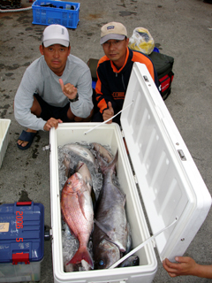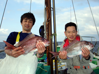 5/05銭洲 右 磯崎氏 マダイ1.4kg 左 藤井氏 マダイ1.4kg 色が違いますね~ 森さん!マダイGETですよ!