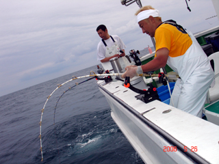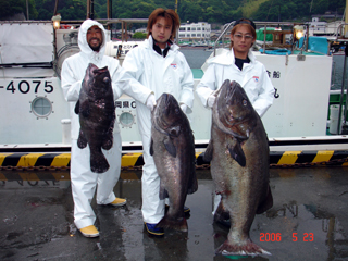 5/23銭洲 右~坂上氏、勝山氏、代理持の国嶋副船長! フルスタンディングバトル!興奮しました! 挑戦者募集中です! イシナギは80kgクラスで約60-70年も生きてます。 釣るにも中途半端な気持ちではアタックできません! 資源の有効活用として、1人1本までとします。 いつまでも巨大魚との格闘を楽しみたいですね! ご理解の程、宜しくお願い申上げます。 船長