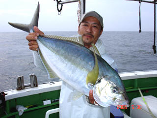 5/17イナンバ 今期初泳がせ!カンパチ7.35kgゲット! 新宿区 坂上綱之氏 激流の中からガツンと釣上げました! |