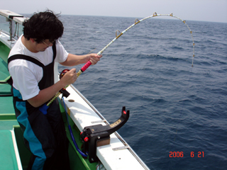 6/21銭洲 初☆銭洲☆初☆とび島丸☆ 大和市 山本氏のカンパチファイト! 竿:ZENISU SP150 リ-ル:TiCA20SD