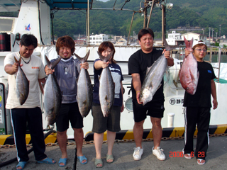6/28銭洲 右~須藤氏、井村氏、川崎シマヤ奥様、シマヤ店長 菊リン(^◇^) 全て赤イカの泳がせです! ムロ勘復活までカウントダウン!