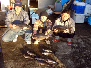 1/05トビシマ 14.7℃澄み加減 テトラポットの皆さん!メジナ40枚以上GET! 小型はリリ-ス! 右~大塚氏42.3cm 進藤氏45.2cm 前山氏37.2cm 前山さん!必勝アイテム有難う(^o^)丿