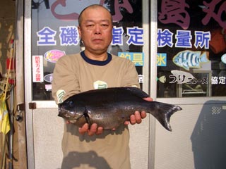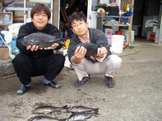 2/06ワレイシ 13.5℃薄濁り 伊豆くしろ研究会 (右)田窪氏 (左)梅原氏 低水温で25-38cm20枚です!頑張りました! |