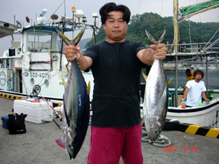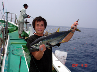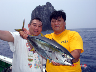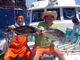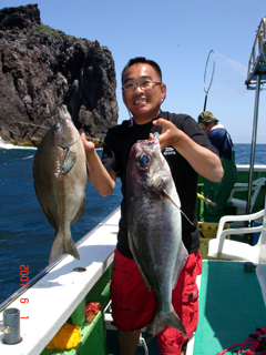 6/01イナンバ 左 初!イナンバ!初!とび島丸 岡山氏 右 加藤氏 巨大メジナで遊べました! かなりのパワーです!