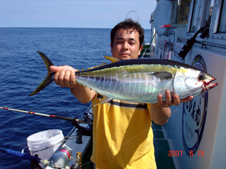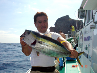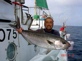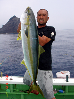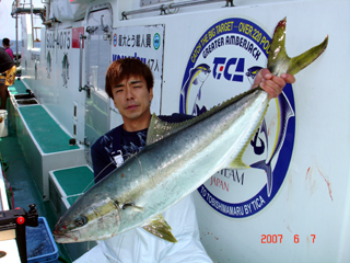 6/07銭洲 埼玉県 鵜浦知志氏 初!とび島丸!デビュー戦にて初!ヒラマサ! 鯖泳がせで8.35kgGET!おめでとう!