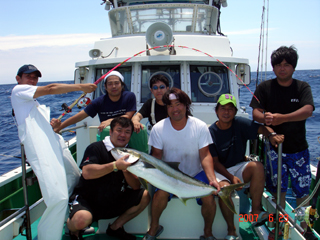 6/06銭洲 後列左 須藤氏ブリ6.5kg 後列中 坂巻氏 マダイ2.3kg 前列左 西本氏 オオカミ12.6kg ヒラマサ10.6kg 前列右 ルア政8.75kg 壮絶な戦いがありました!