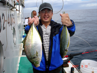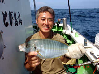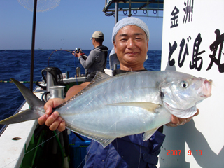9/10銭洲 初!とび島丸☆ 小泉氏 シマアジ釣ってご機嫌です(^o^)丿
