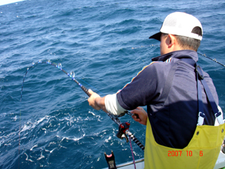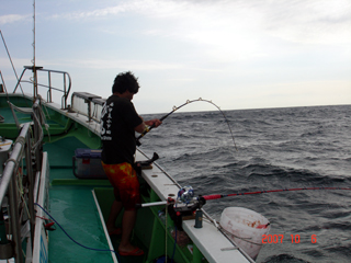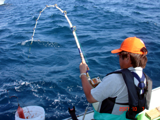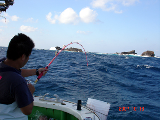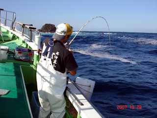 10/18銭洲 鈴木氏のカンパチファイト! ロッド:剛樹 リール;Tica T-Special2007