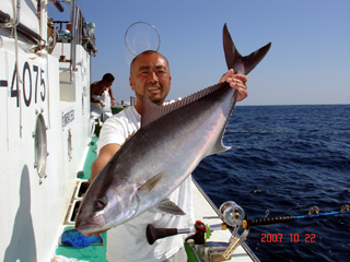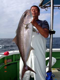 10/07銭洲 気合の入ったファイトで満足の鈴木浩二氏 カンパチ12.4㎏ 満足!満足(^v^)