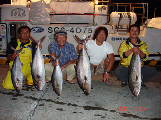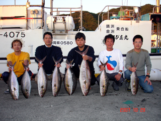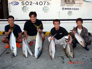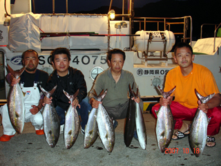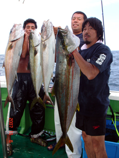 10/21銭洲 左3番から 伊東氏、岡田氏、関根氏、柴田氏 カンパチ3.3-13.45kg10本 ヒラマサ10.0-14.4kg4本 マダイ7.4kg 爆釣!