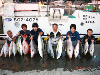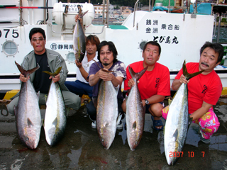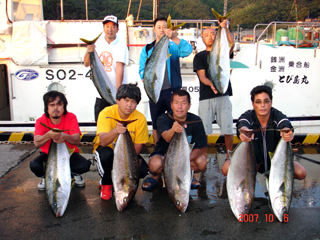 10/06銭洲 小野寺氏、佐々木氏、国嶋副船長 鈴木氏、伊東氏、金本氏、塩見氏 カンパチ12.5-14.85kg3本 ヒラマサ9.9-12.5kg5本 爆釣です!