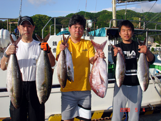 5/04銭洲 麦イカでカンパチ1.45-5.4kg6本! マダイ3.4kgGET!
