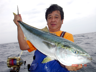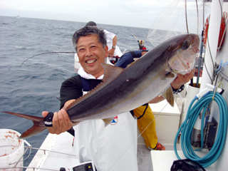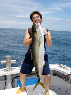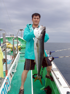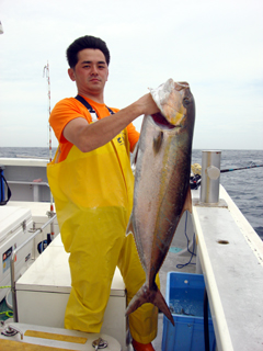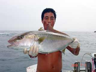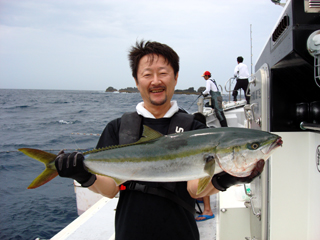 7/04 銭洲 宮城新吾氏 カンパチ7.7kg 投入一番!気合入ってます! |