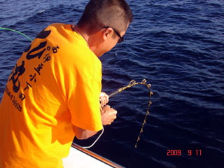 9/14 銭洲 カンパチ2.15-4.9kg4本 9/14 銭洲 国嶋副船長 頑張ってます!