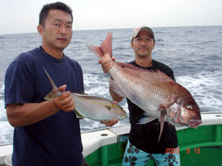 9/15 銭洲 緒方氏&水留氏 ムロアジの泳がせでマダイ7.75kgGET!