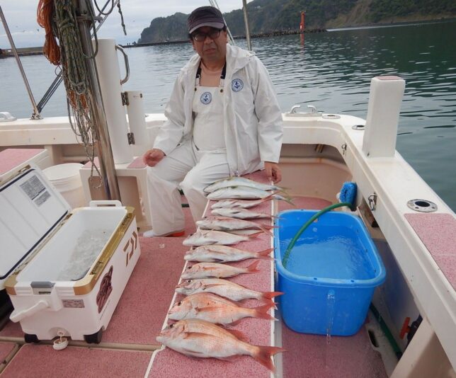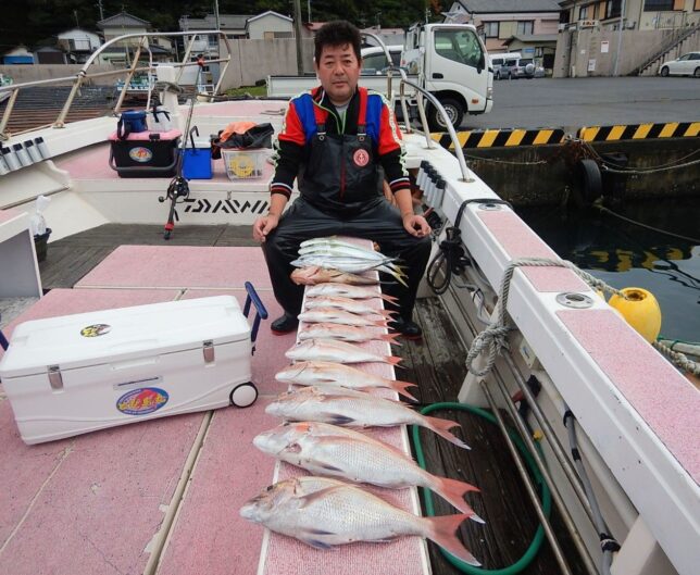 速報 マダイ釣り! 2025年10月26日 健司船長 土肥沖マダイ狙い!雨も少なくベタ凪でした。マダイ1.37kg頭で9~9計18枚!ハリス切れ有り!他イナダ、ハナダイ、オオモン、ソーダ等も!もういいよ~てことで少し早上がりでした。お疲れ様でした。反応良く狙い目ですよ~!
