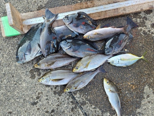 お知らせ, 磯 磯釣り渡船です 2025年11月30日 とび島丸事務局 こんにちは! 小下田渡船です。 ✳︎11月30日の釣果をお知らせします✳︎ 天候は晴れ。 水温は19.9℃。 水色は澄み。 潮は上りのち下りゆるい。 各磯メジナ30-38.2cmが1-6計7枚。 イサキが6枚。 シマアジが1枚。 次回の出船予定は明日12月1日です。 状況は電話にてお問い合わせくださいませ。
