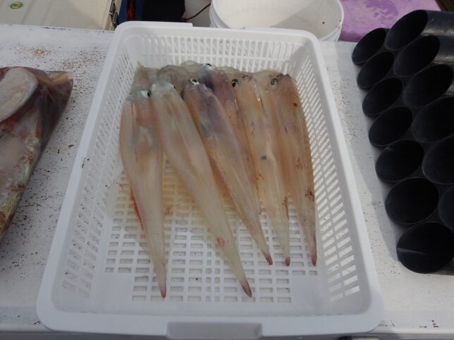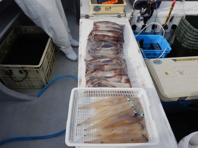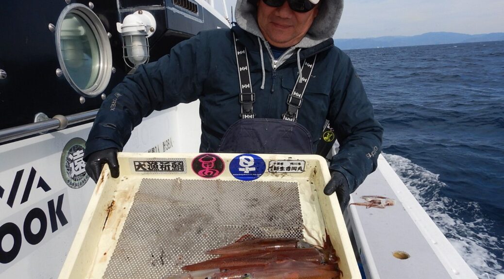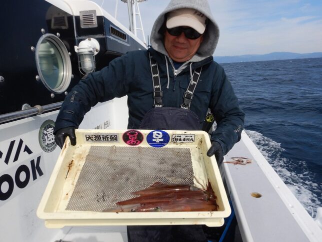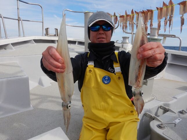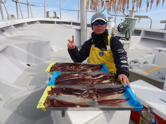 速報 ヤリイカ狙い! 2026年2月10日 健司船長 石花海ヤリイカ狙い!45cm級頭でクロ混じりトップ58杯!後半2時間ジャンボヤリイカ探索するもダメでした。金メダル欲しかったんですが、銅メダル6点7点掛け多かったです。5名から出船します!お問い合わせください。