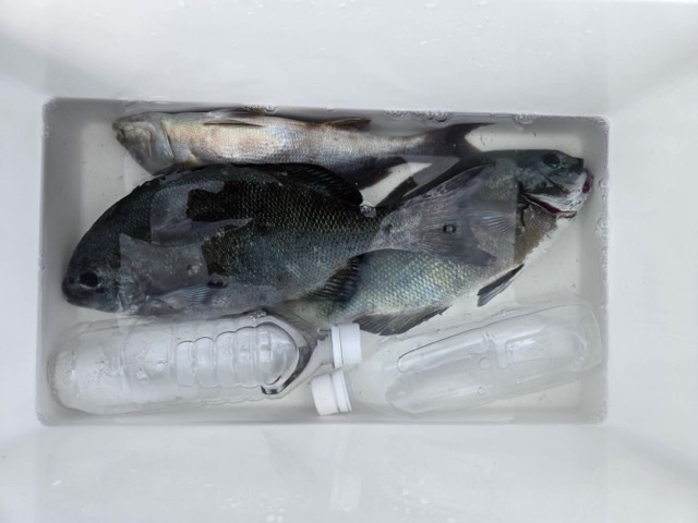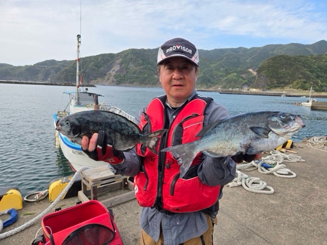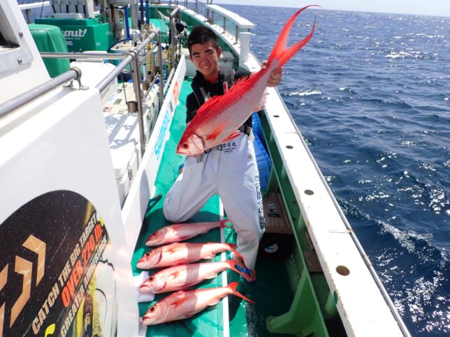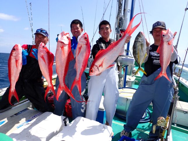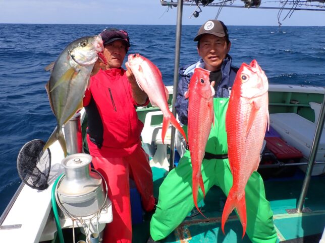 中深場は食い気ありありでオナガ、ハチビキ、アカイサキなど、赤い魚が沢山釣れてお土産バッチリでした!