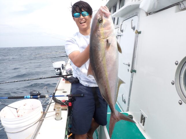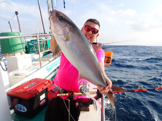 お知らせ, 速報, 銭洲 銭洲チャレンジ! 2025年9月27日 忠文船長 銭洲 カンパチ狙い!2025/09/27ムロアジ泳がせ釣りです。 カンパチ4.4〜8.6kg6尾 ツムブリ3〜5kg級7尾 ムロアジ順調に釣れましたが、泳がせ釣りでは、ハリス切れ、リーダー切れ、すっぽ抜けあり。潮たるったるで、ワンパク多発でした。糸引きアジの巨大なのがまじり、ウメイロお土産です。反応多く、チャンスありそうですよー 本日もチャレンジ有難う御座いました。