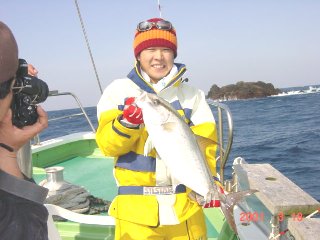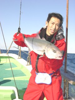 2001/3/25銭洲 渋々の中、頑張って釣ったカンパチ 豊橋のオオタカさんチ-ム |