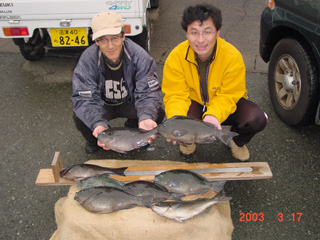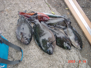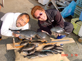 3/19高島 左 クニマン 右 鈴木特派員 クニマン メジナ25-35cm4枚 鈴木特派員 メジナ25-36cm14枚 サヨリ混じる! 今日の出来事。クニマンは妖怪ボ-ラをヒットし『でけぇでけぇ!』と騒いでました。(ーー;)