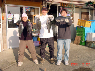 2/24トビシマ 16.0℃ 濁り 31ー48cm25枚 右から 一戸さん、広田さん、嘉谷さんです!